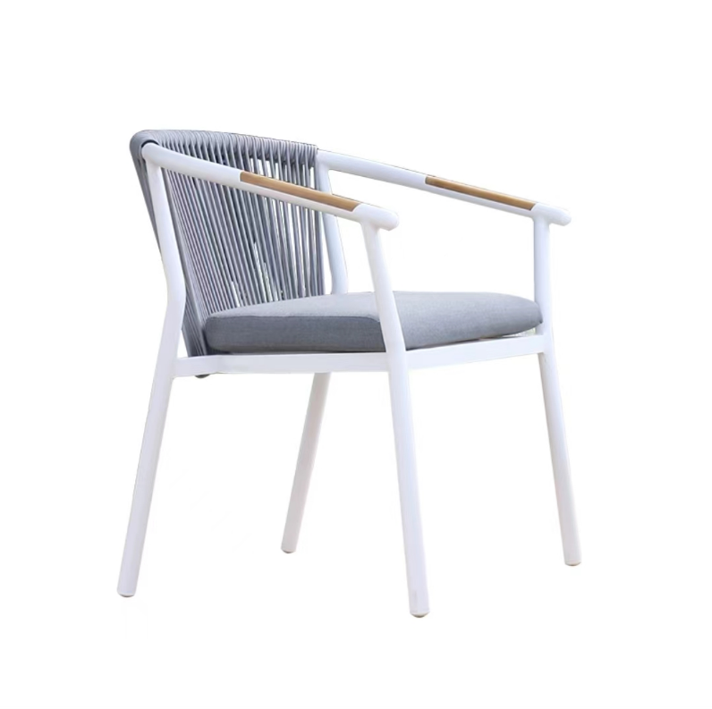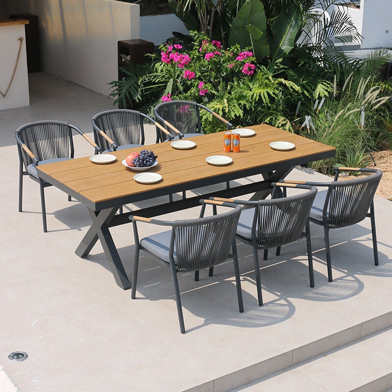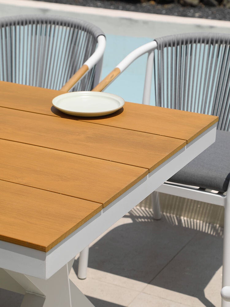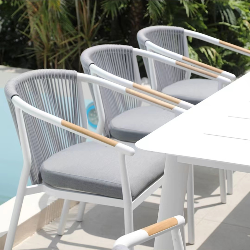 + 6 chaises en aluminium avec finitions en tressage de corde avec revêtement en teck sur le dessus des accoudoirs.