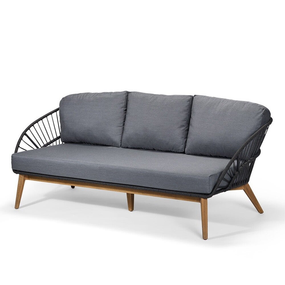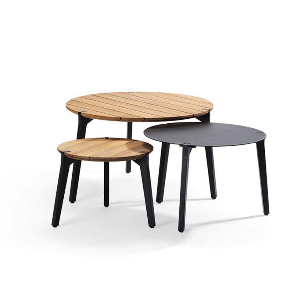 - de 2 tables basses avec plateau en teck et pieds en aluminium (diamètre 70x40 cms et 40x30 cms)